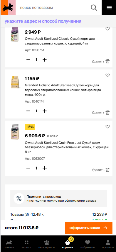 Дополнительная механика: пет-коины. Они начисляются при покупке одежды, игрушек и аксессуаров от 500 рублей. Монеты обмениваются на скидку до 30% при покупке лежаков, домиков и когтеточек.