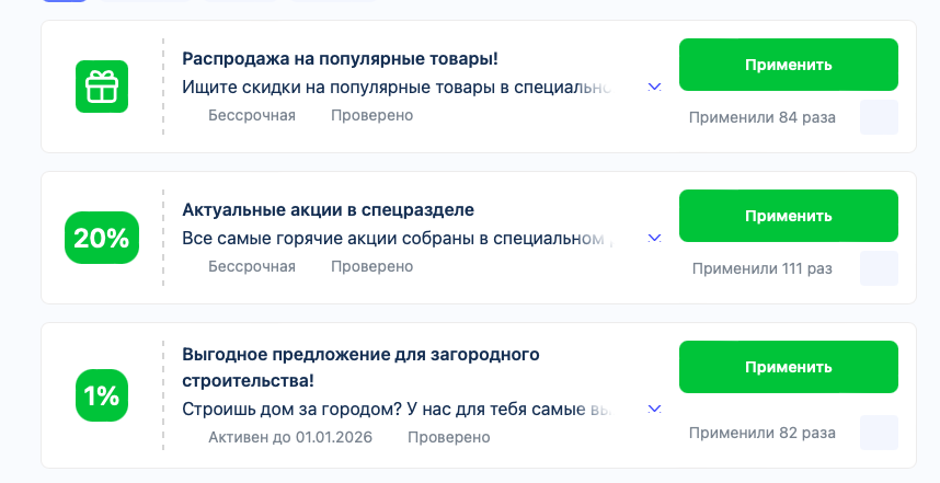 Специальные коды, сезонные акции и купоны на скидку помогают покупать материалы для ремонта и строительства по выгодным ценам. Petrovich предлагает клиентам 12 актуальных промокодов, которые действуют на 30 декабря 2025 г.. Используйте их в декабре 2025, чтобы экономить даже на крупных заказах и снизить стоимость покупок.
