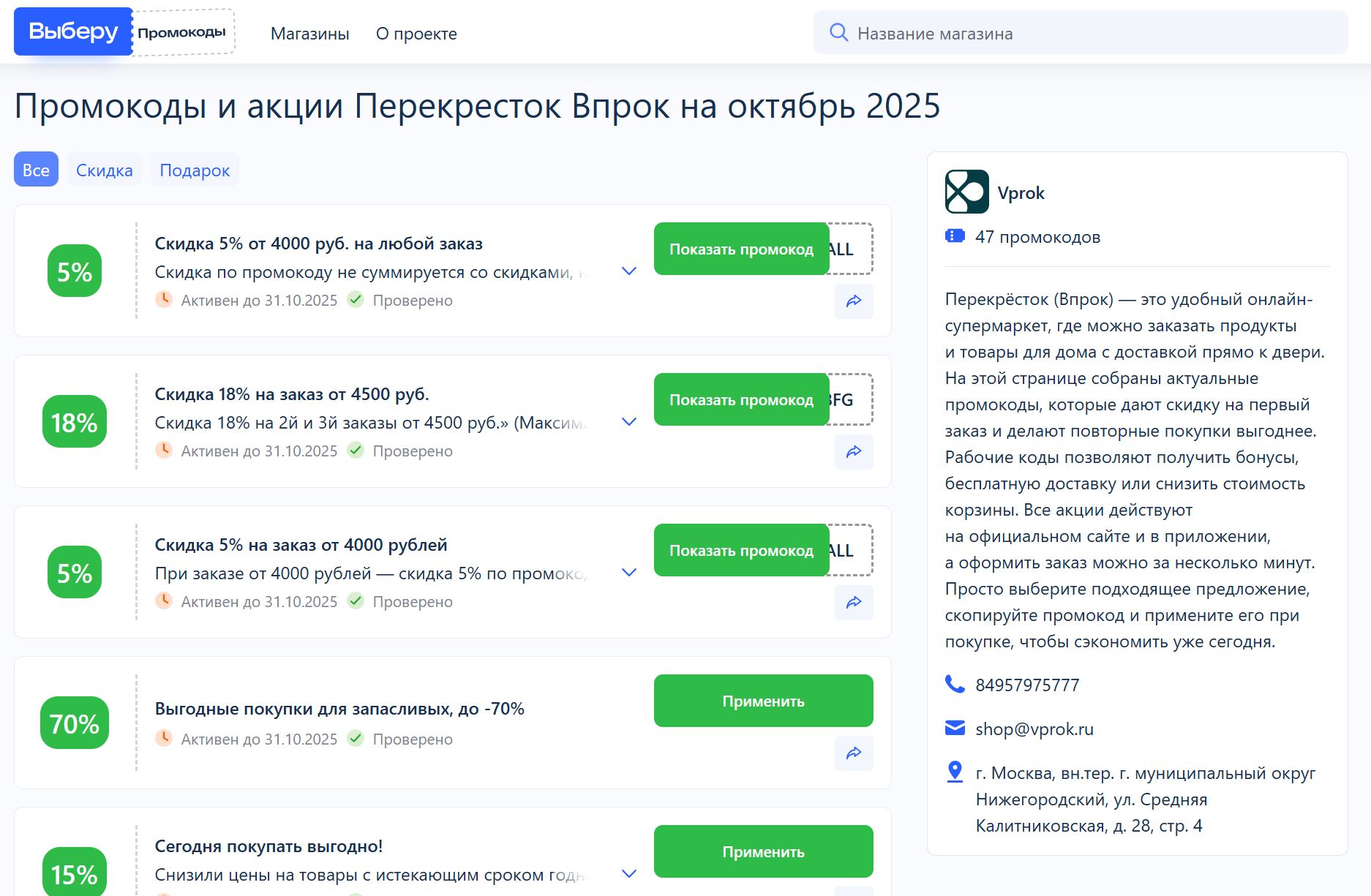 Онлайн-гипермаркет Vprok ежедневно проводит акции, предлагает персональные скидки, промокоды, применять которые могут новые и постоянные клиенты. Для каждого покупателя подготовлены бонусы и подарки. На 15 ноября 2025 г. доступно 43 активных промокодов и специальных предложений для выгодных онлайн-покупок.